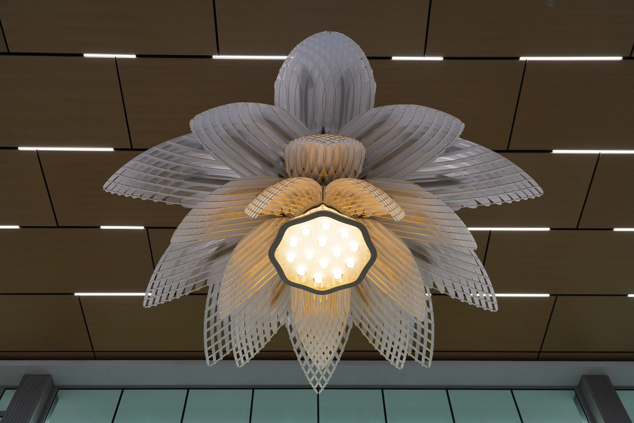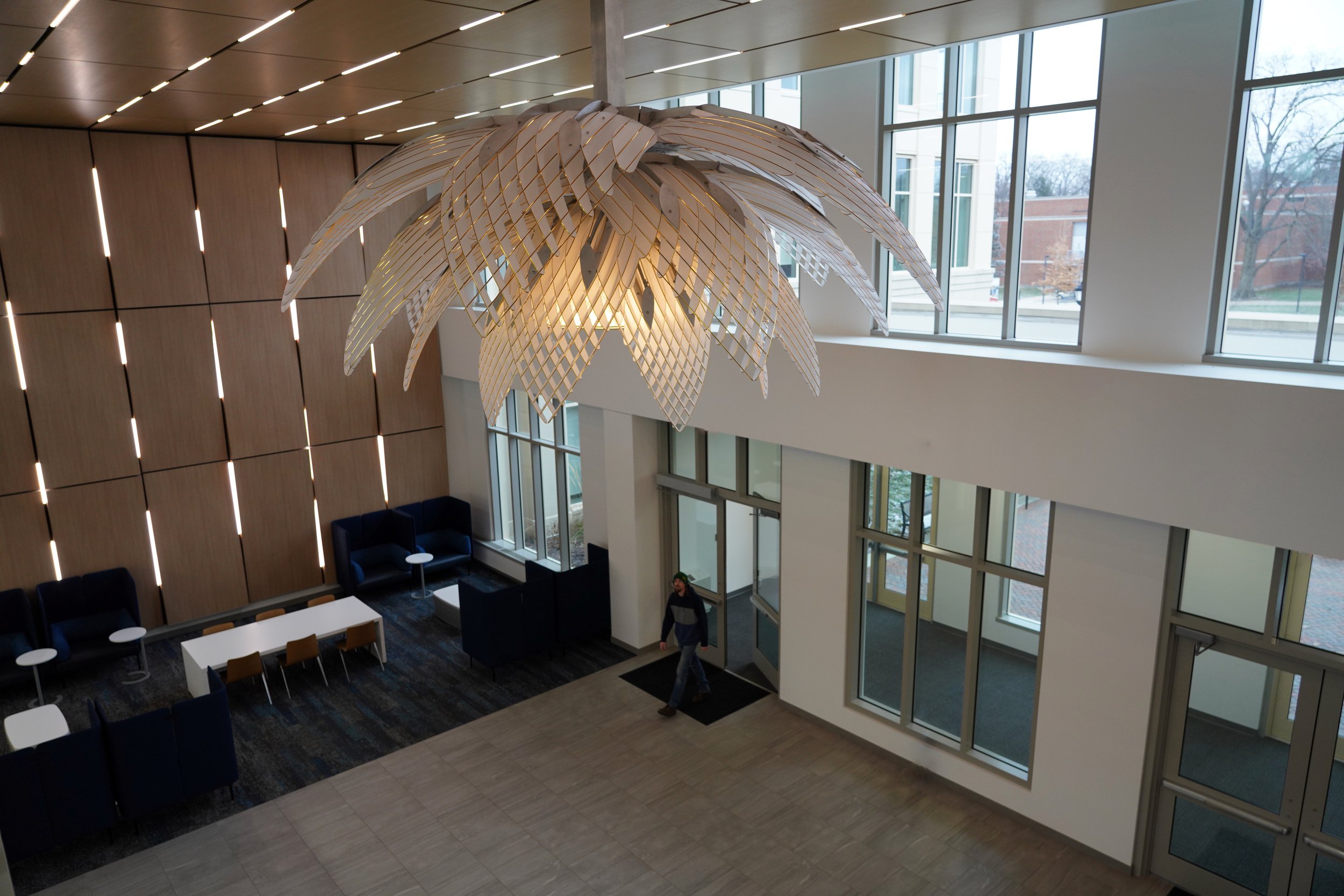 Bloom, a unique ceiling hung sculpture made of frosted acrylic with gold leaf edges, will become a stunning new addition to the Miami University in Dayton, Ohio!